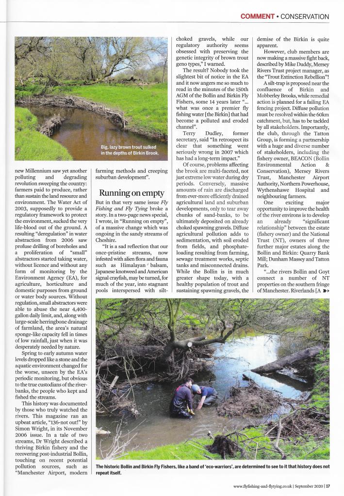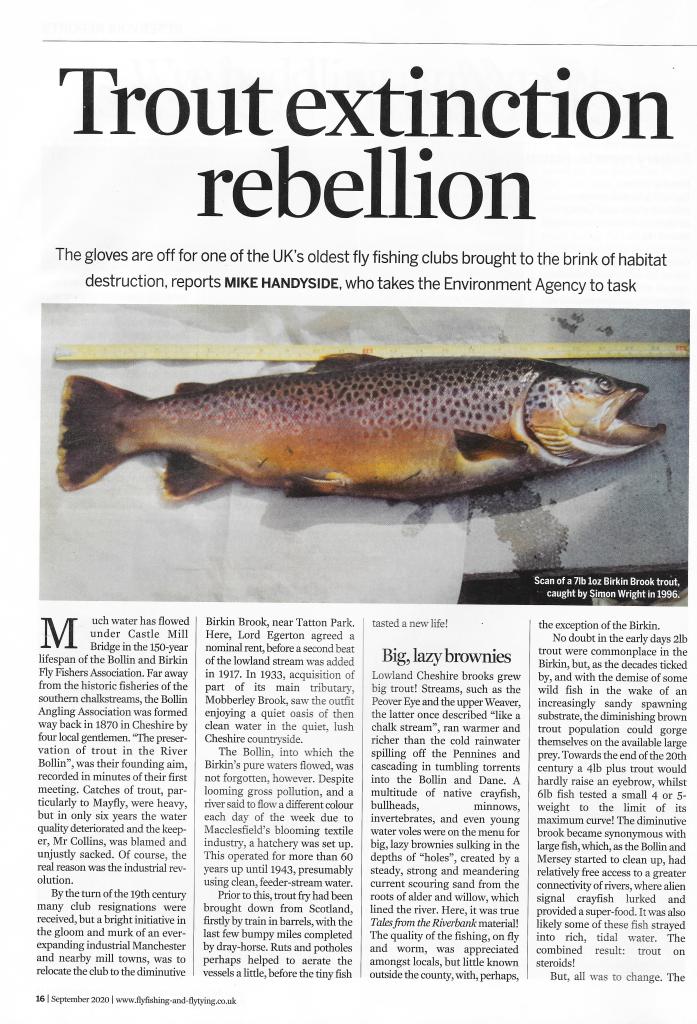 There then followed subsequent years records of the association that included press accounts of public and Council meetings, actions in the Courts and correspondence with various authorities, all concerned with ending the industrial and other pollution affecting the river; but it was to no avail. This realisation was too late for the ex-river keeper and too late for the fishery. The very damaging effects of pollution persisted on the River Bollin and in one form or another continued until very recently. More modern-day developments such as Manchester Airport, modern farming methods and creeping suburban development took over from old style industrial pollution in creating a decline of the River Bollin. However, contemporary wisdom, and more rational actions, has seen a huge improvement in the water quality that may eventually see it restored to a thriving fishery of its pre-industrialised period.